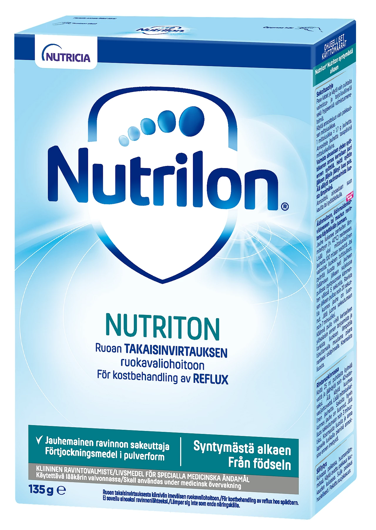 Äidinmaito on imeväisikäisen parasta ravintoa. Kysy ohjeita neuvolastasi ennen kuin aloitat äidinmaidonkorvikkeen, vieroitusvalmisteen tai imeväiselle tarkoitetun kliinisen ravintovalmisteen käytön. Nutrilon Nutrition -valmistetta on käytettävä lääkärin valvonnassa. Nutrilon Nutriton on kehitetty täysiaikaisena syntyneille imeväisille. Ei sovellu alle 1800 g painaville keskosille tai niille, jotka tarvitsevat erityistä tukea saavutuskasvuvaiheeseen. Lapsen terveyden kannalta on tärkeää noudattaa tarkoin pakkauksessa olevia valmistus- ja säilytysohjeita. Pyydä terveydenhuollosta ohjeita annostelusta.